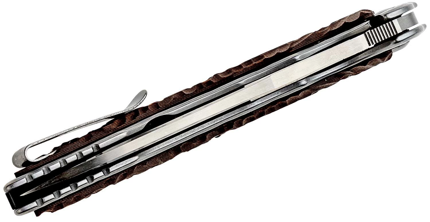 Die Klinge ist aus rostfreiem Stahl 8Cr13MoV gefertigt. Es öffnet sich mit dem IKBS-Kugellagersystem und Flipper und wird in der offenen Position durch die Frame-Lock gesichert. Der Griff ist aus zwei verschiedenen Materialien gefertigt – Edelstahl mit Hammerschlagspuren und haltbaren G10.Das Messer ist mit einem Clip zum Tragen in einer Hosentasche ausgestattet.