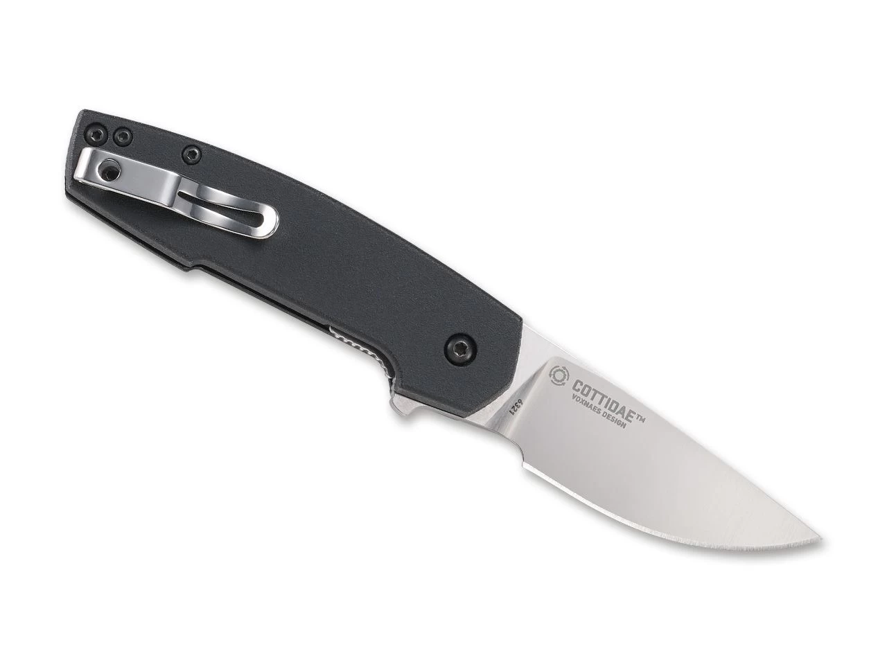 Jesper Voxnaes ließ sich bei der Gestaltung der Cottidae von Fischen inspirieren. Die dünnen Linien gehen von der Klinge aus D2-Stahl aus, die auf einem Kugellager „läuft“. Er lässt sich mit dem Flipper schnell öffnen. Der Liner Lock sichert das geöffnete Messer. Der robuste Griff ist aus Aluminium gefertigt. Dank der patentierten Field Strip Technologie kann das Messer ohne Werkzeug zerlegt und gereinigt werden. Das Messer hat einen Clip zum Tragen in der Hosentasche.