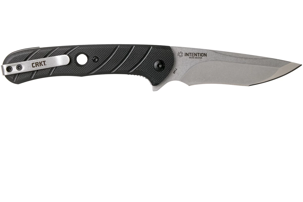 Das CRKT Intention 7160 ist ein EDC-Taschenmesser, entworfen von Eric Ochs. Dieses Messer ist schnell und einfach mit dem Flipper zu öffnen. Im geöffneten Zustand ist das Messer mit einer soliden Sicherung vom Typ Liner-Lock gesichert. Der Griff ist aus strapazierfähigem G10-Material gefertigt. Die Klinge ist aus rostfreiem Stahl 8Cr13MoV geschmiedet.