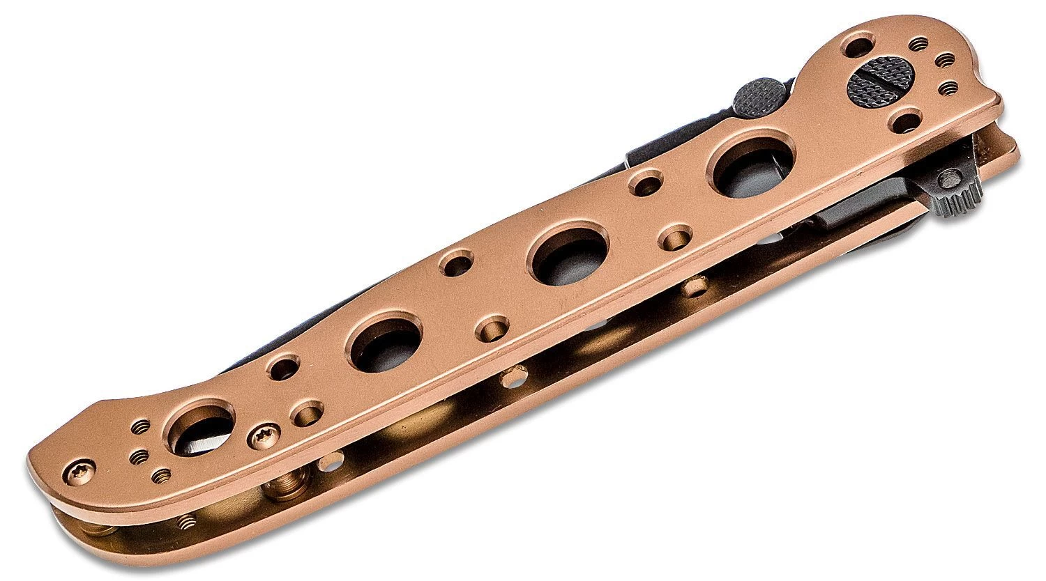Schwarze Klinge aus rostfreiem Stahl 12C27, die in der offenen Position durch eine Framelock-Sicherung gesichert ist. Wird mit einem Flipper oder einem Daumenpin geöffnet. Der Griff ist aus rostfreiem Stahl mit einer bronzefarbenen Titanoberfläche. Auswechselbare Schnalle zum Tragen in der Hosentasche.