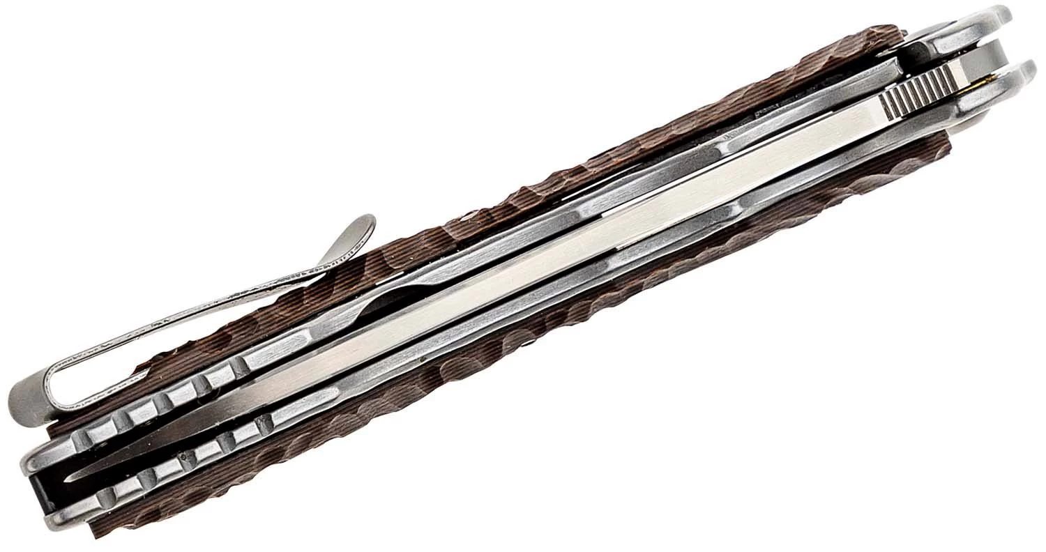 Die Klinge ist aus rostfreiem Stahl 8Cr13MoV gefertigt. Sie öffnet sich mit dem IKBS-Kugellagersystem und Flipper und wird in der offenen Position durch die Framelock-Sicherung gesichert. Der Griff ist aus zwei verschiedenen Materialien gefertigt – rostfreiem Stahl mit Hammerschlägen und strapazierfähigem G-10. Das Messer ist mit einem Clip für den Taschentransport ausgestattet.