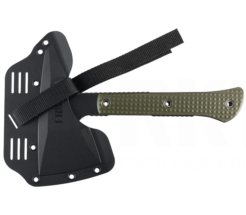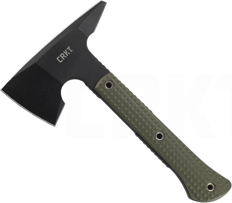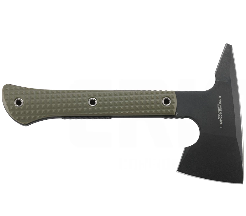 Die Jenny Wren Compact Axt von CRKT ist ein handliches Werkzeug. Der Outdoor-Tomahawk kommt auf eine Gesamtlänge von 26 cm, damit kann er leicht zu jedem Abenteuer und zum Camping mitgenommen werden. Eine schwarze Pulverbeschichtung schützt den SK-5 Kohlenstoff-Stahl der 6,6 mm starken Klinge, die so einiges ab haben kann. Dreiseitig geschliffen bietet die Jenny Wren Compact Axt genügend Einsatzmöglichkeiten. Durch die strukturierten Griffschalen aus dunkelgrünem FRN liegt die Axt auch bei Nässe sicher in der Hand. Der Designer Ryan Johnson hat schon so einiges für CRKT gemacht und hat auch bei der Compact Axt darauf geachtet, dass die Scheide MOLLE- kompatibel ist. Wer es mag, kann eine Fangschnur am Ende des Griffes anbringen.