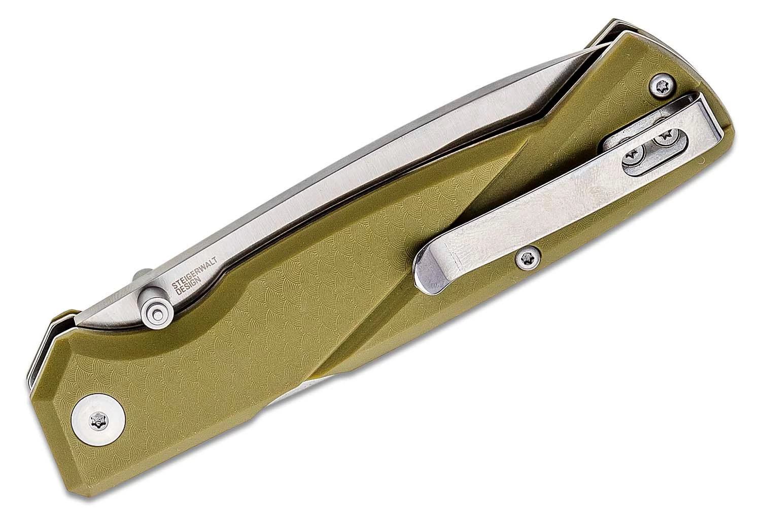 Die Klinge aus rostfreiem 8Cr13MoV-Stahl lässt sich mit einem Stift an der Klinge öffnen und wird durch eine Frontverriegelung in der offenen Position gehalten. Der Griff ist aus strapazierfähigem GRN-Material gefertigt, das mit Edelstahleinlagen verstärkt ist. Das Messer ist mit einem Clip für das Tragen in einer Tasche ausgestattet.
