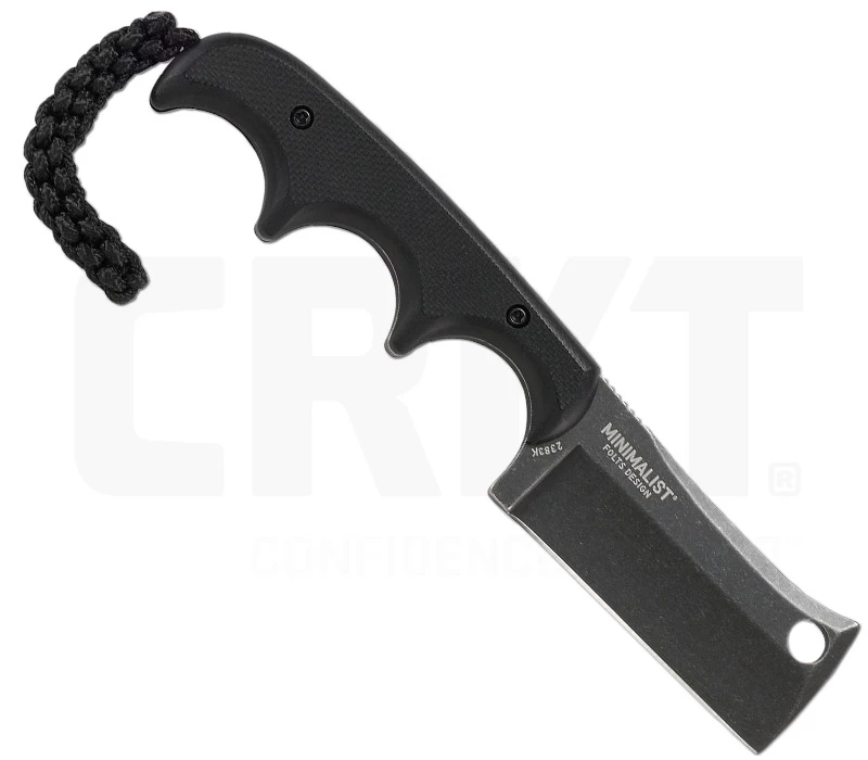 Die Minimalist-Serie vom Designer Alan Folts hat sich weltweit bereits eine beachtliche Fangemeinde aufgebaut. Diese praktischen Neck-Knives kennzeichnen sich durch ihre ergonomische Griffform und vor allem durch ihre kompakte Größe aus. Die 5Cr15MoV Klinge des Minimalist Cleaver Blackout ist einem Hackmesser nachempfunden und mündet in die mit Fingermulden versehenen Griffschalen. Diese bestehen aus texturiertem G10 und sind ebenso wie die Klinge im Allblack-Style gehalten. Gerade einmal 48 g wiegt das Neck-Knife, wodurch es mit Leichtigkeit um den Hals getragen werden kann. Realisiert wird das Tragen durch eine Zytelscheide inklusive Fangriemen. Besonders geeignet sind die Minimalist Messer für kleinere Outdoor-Schneidaufgaben.
