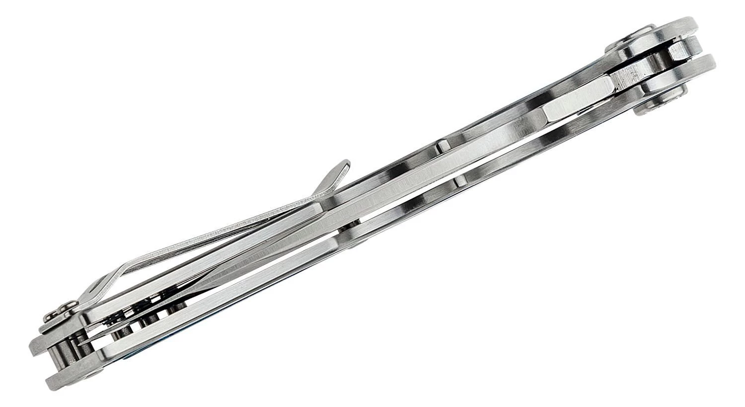 Brian Tighe und Glenn Klecker haben das Klecker NIRK™ Schließmesser in einem sehr dynamischen und funktionalen Design neu interpretiert. Der Stahlrahmen ist nicht nur optisch aufregend, sondern bietet auch einen beeindruckenden Griff für dieses Modell. Glenns patentierter Verriegelungsmechanismus ist so konzipiert, dass die Klinge umso stärker gesichert wird, je fester man den Griff umschließt. Das Design von Brian und die sanfte Kurve der Klinge ergeben sich aus der Form des Griffs. Damit die Klinge reibungslos läuft, sorgt ein speziell angebrachtes Mini-Kugellagersystem für einen schnellen und reibungslosen Betrieb.