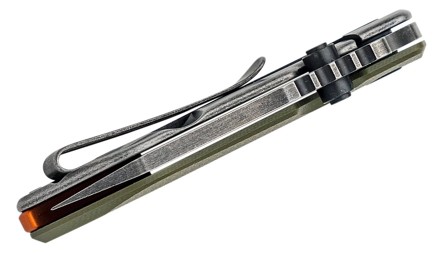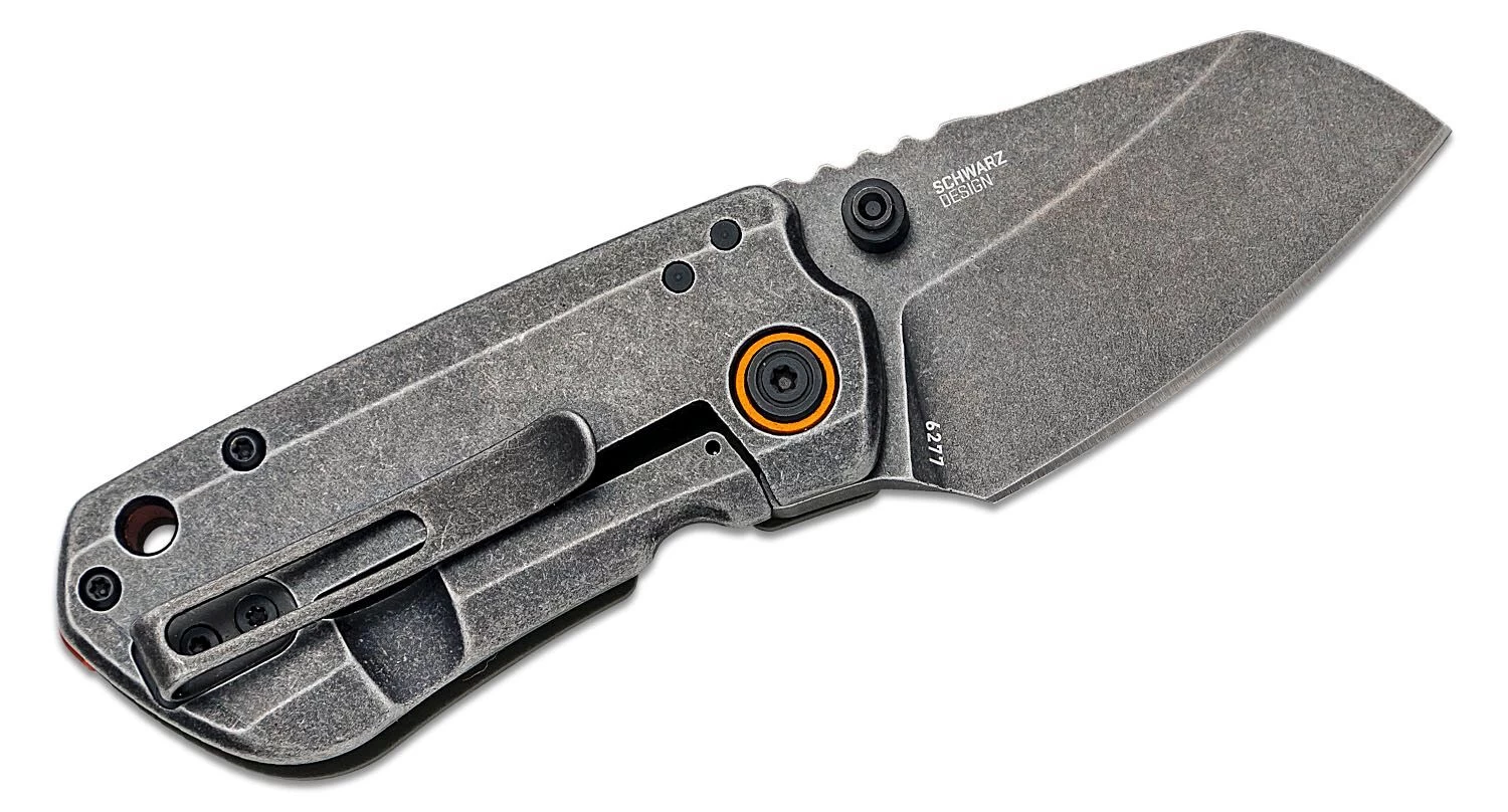 Die Klinge ist aus D2-Werkzeugstahl gefertigt und wird mit einem Daumenpin geöffnet. Gesichert wird sie in der offenen Position durch ein Framelock. Die grüne Klinge ist aus G-10 Material gefertigt, die Klinge mit Sicherung ist aus rostfreiem Stahl. Auf dem Griff befinden sich deutlich sichtbare Elemente in oranger Farbe, die einen guten Kontrast zu den anderen Teilen des Messers bilden. Das messer hat einen clip für das tragen in einer tasche und ein lanyard-loch.