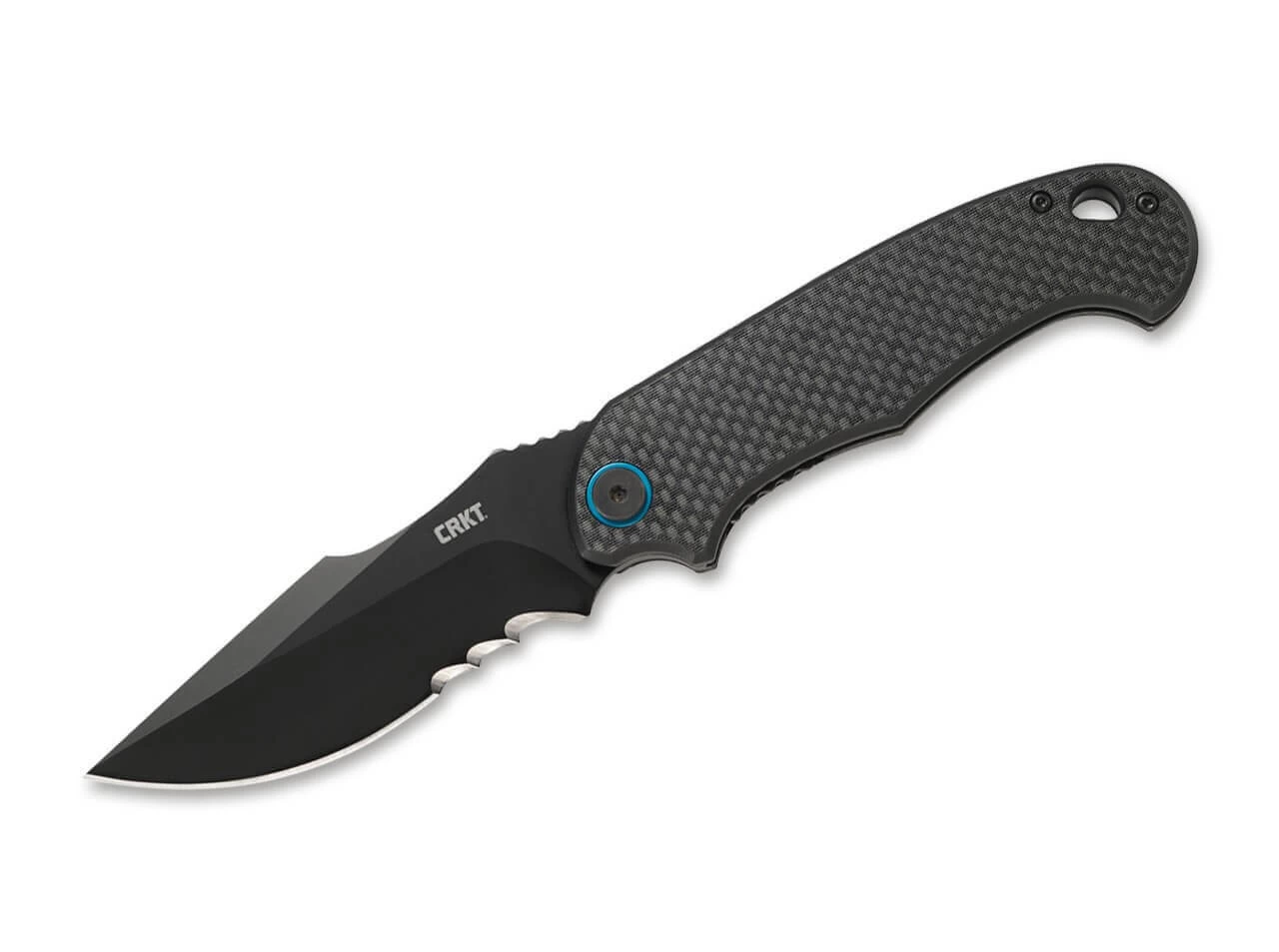 Aus der Sicht von Designer Jim Hammond ist das CRKT P.S.D. Black mehr als nur ein Messer. Vielmehr ist es ein Particle Separation Device. Der komplett schwarze taktische Folder überzeugt mit der kugelgelagerten Harpoon Klinge aus 4116 und dem ergonomischen Griff aus Kohlefaser und G10. Durch die federunterstützte Flipper Öffnung ist der Folder sofort einsatzbereit. Der Linerlock verriegelt die Klinge zuverlässig und ermöglicht ein sicheres Arbeiten. Der blau anodisierte Ring an der Klingenachsschraube setzt einen farblichen Akzent und betont den modernen Anspruch des Messers. Mit Clip (Tip-up/r) und Fangriemenöse.
