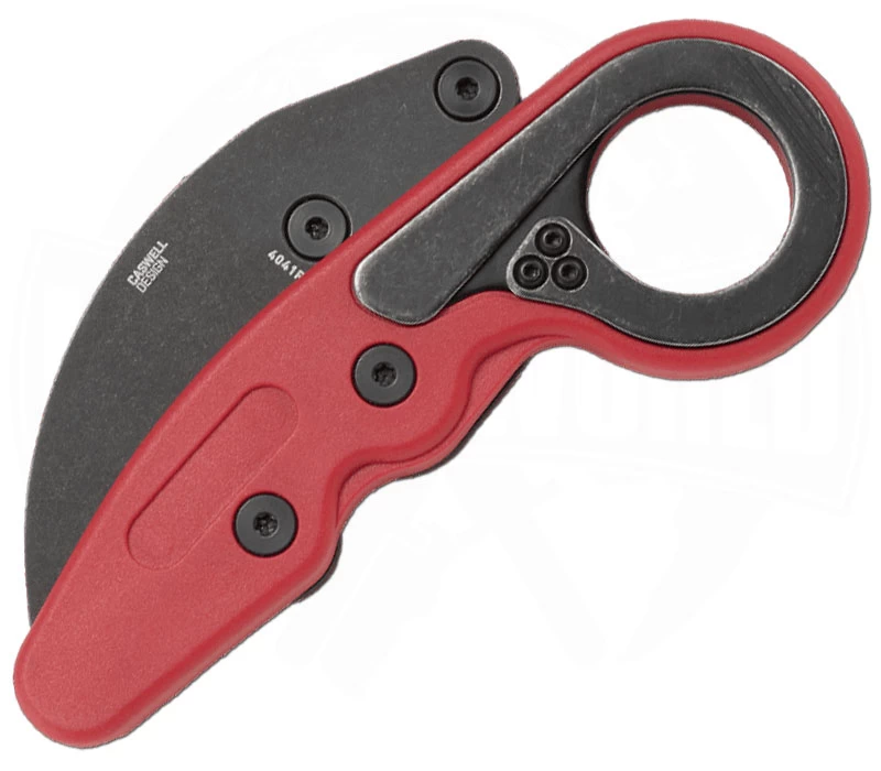 Das Messer kombiniert die Eigenschaften eines Karambit-Messers mit der praktischen Handhabung eines Klappmessers und setzt damit neue Maßstäbe. Die kohlenstoffhaltige 1.4116-Klinge ist 6,2 cm lang und verfügt über eine Hawksbill-Form, die vom Griff parallel nach vorne herausgeschwenkt und verriegelt wird. Der Griff besteht aus Grivory, einem leichten und dennoch äußerst robusten Thermoplastik, das zum stabilen Gesamtbild des Messers beiträgt. Die durchdachte Gestaltung des Designs zeigt sich auch im flach am Griff liegenden Befestigungsclip, der bei Bedarf per Fingerdruck aus der Versenkung erscheint, um das Messer an der Ausrüstung zu befestigen. Das signal-rote Grivory harmoniert mit der schwarz beschichteten Klinge und Mechanik hervorragend und geben dem ohnehin schon spannenden Messer einen noch cooleren Look.