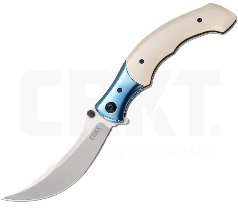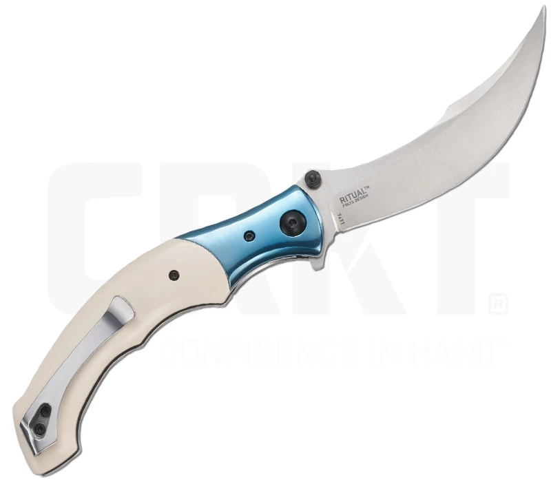 Die amerikanische Firma Columbia River Knife and Tool oder auch CRKT genannt, ist bekannt dafür, innovative und außergewöhnliche Messer auf den Markt zu bringen, die nicht nur mit einer außergewöhnlichen Funktionsweise oder Optik, sondern auch mit einem unglaublichem Preis/Leistungs-Verhältnis überzeugen. Dieser Ruf spiegelt sich auf beeindruckende Art und Weise im Ritual wider, welches den Betrachter mit seinem schönen Erscheinungsbild förmlich fesselt. Die geschwungene Perser-Klinge verschwindet trotz ihrer Größe fast komplett im Heft, das aus feinem Elfenbein-Micarta gefertigt ist. Abgeschlossen wird die Griffpartie von einer auffälligen Edelstahlbacke, die metallisch blau anodisiert ist. Öffnen lässt sich die federunterstütze Klinge durch den Flipper oder den Daumenpin, woraufhin diese blitzschnell hervorspringt. Sie besteht aus Sandvik 12C27 Stahl, welcher sich gut für alltägliche Belange eignet. Ergonomisch geforme Griffschalen bestärken das Gesamtbild des Messer genauso wie der praktische Pocket-Clip und runden diesen Exot noch einmal ab.