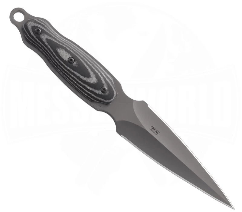 Hervorstechend durch ein ideales Design und eine Verarbeitung, die nichts zu wünschen übrig lässt, beansprucht das Shrill die Aufmerksamkeit eines jeden Tactical Liebhabers für sich. Ausgestattet ist es mit einer 12,1 cm langen Dolchklinge aus 8Cr13MoV-Stahl, die beidseitig angeschliffen ist. Entworfen wurde das Einsatzmesser vom Messermacher Matthew Lerch. Das Full-Tang-Messer verfügt über Griffauflagen aus grau-schwarzem Micarta, die das Handling den Einsatzanforderungen anpassen. Immer praktisch am Mann, ist das schicke Shrill über die Lederscheide, die über einen Clip verfügt.